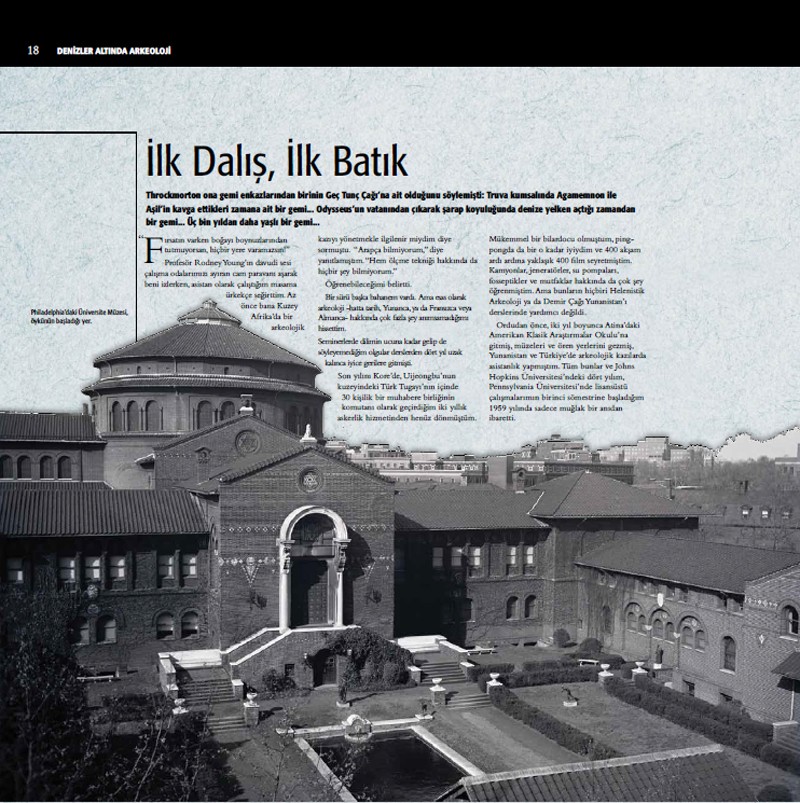 Yepyeni bir alanda başından itibaren bulunuyor olmakla, daha önce hiç yapılmamış şeyleri yapma fırsatım vardı. Milli Eğitim Bakanlığı'nın izni ve Peter’ın teşvikiyle 1960 yılında Türkiye’nin en çok ziyaret edilen arkeolojik müzesi haline gelen bir müze kurmaya başlamış olmaktan gurur duydum. 1964 yılında, Connecticut, Groton’da Ann’i Amerika Birleşik Devletleri'nde inşa edilen ilk ticari denizaltı Asherah’ı şampanya şişesini kırarak denize indirirken izledim. Üç yıl sonra ekiplerimden biri ilk kez antik bir batığın yerini sonarla tespit etti. 1970 yılında sadece batık arkeolojisine adanmış bir enstitü, Su Altı Arkeoloji Enstitüsü'nü (INA) oluşturdum ve sonra Amerika Birleşik Devletleri'nde su altı arkeolojisinde ilk akademik programı Texas A&M Üniversitesi'nde kurdum; bölümün şu anda basınçlı hava ile dalmada rekorlar kıran öğrencileriyle birlikte, dört kıtada batık gemiler arayan ve kazılarını yapan yedi öğretim üyesi var.
